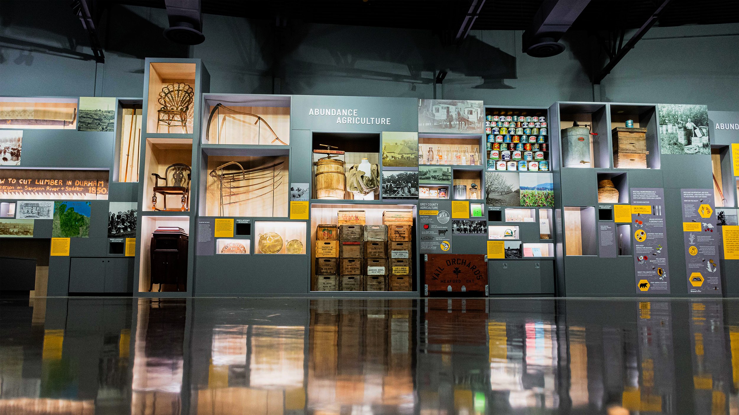 With Grey’s in-house team, Origin Studios led a multi-phase project to amplify the region’s diverse and distinct stories while getting more of the collection on display. Phase one established styling for the gallery along with affordable modular exhibitry and a custom process for future phases. Each phase included a robust artifact placement process and further developed the approach to accommodate new objects and evolving narratives. Working from a point-cloud scan, our design balances long-term flexibility for artifact rotation with a more inclusive, cohesive, and seamless display. Exhibitry was intentionally designed offset from the gallery’s curved wall, creating visual clarity while discreetly integrating storage and operational space behind the exhibitry which reflects day-to-day museum needs. Origin also provided strategic interpretive planning and graphic styling that empowers the in-house team to continue updating the galleries over time. Grounded in place-making and the communities that make up Grey County, this exhibition facilitates connections with the past while remaining future-focused and responsive.